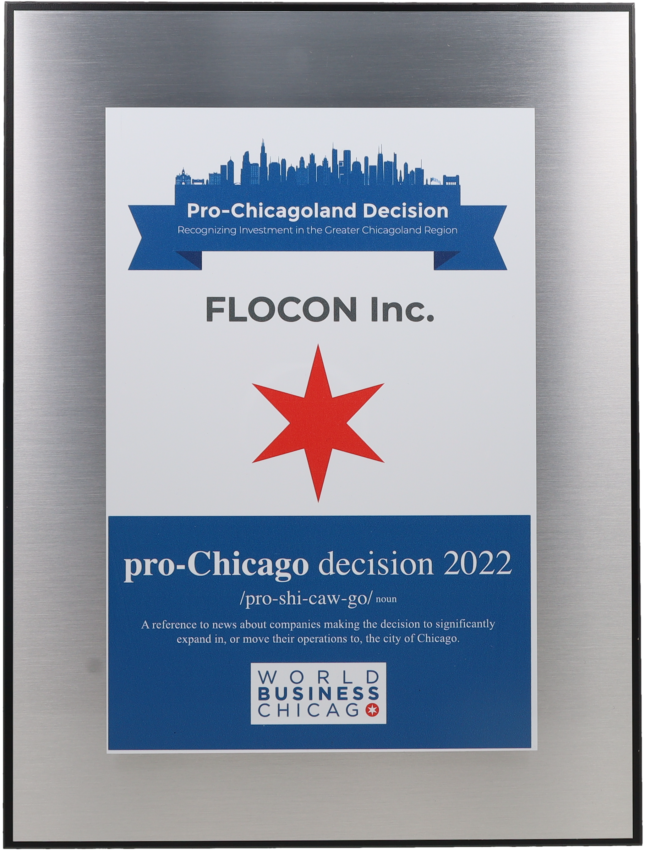 Woodstock, Ill. – March 3, 2023 – FLOCON(R), INC., a manufacturer of paint markers, fine mist sprayers, soap and lotion pumps and trigger sprayers, was awarded the Pro-Chicagoland Decisions Award by World Business Chicago, the City of Chicago’s economic development agency.